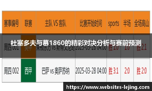 综合以上四个方面,我们清晰地看到杜塞多夫与慕1860之间存在着复杂而丰富的背景。从近期状态到历史交锋,再到战术布置,每一个环节都潜藏着变化。而这不仅决定了本次碰撞结果,也很可能影响双方未来的发展走势。